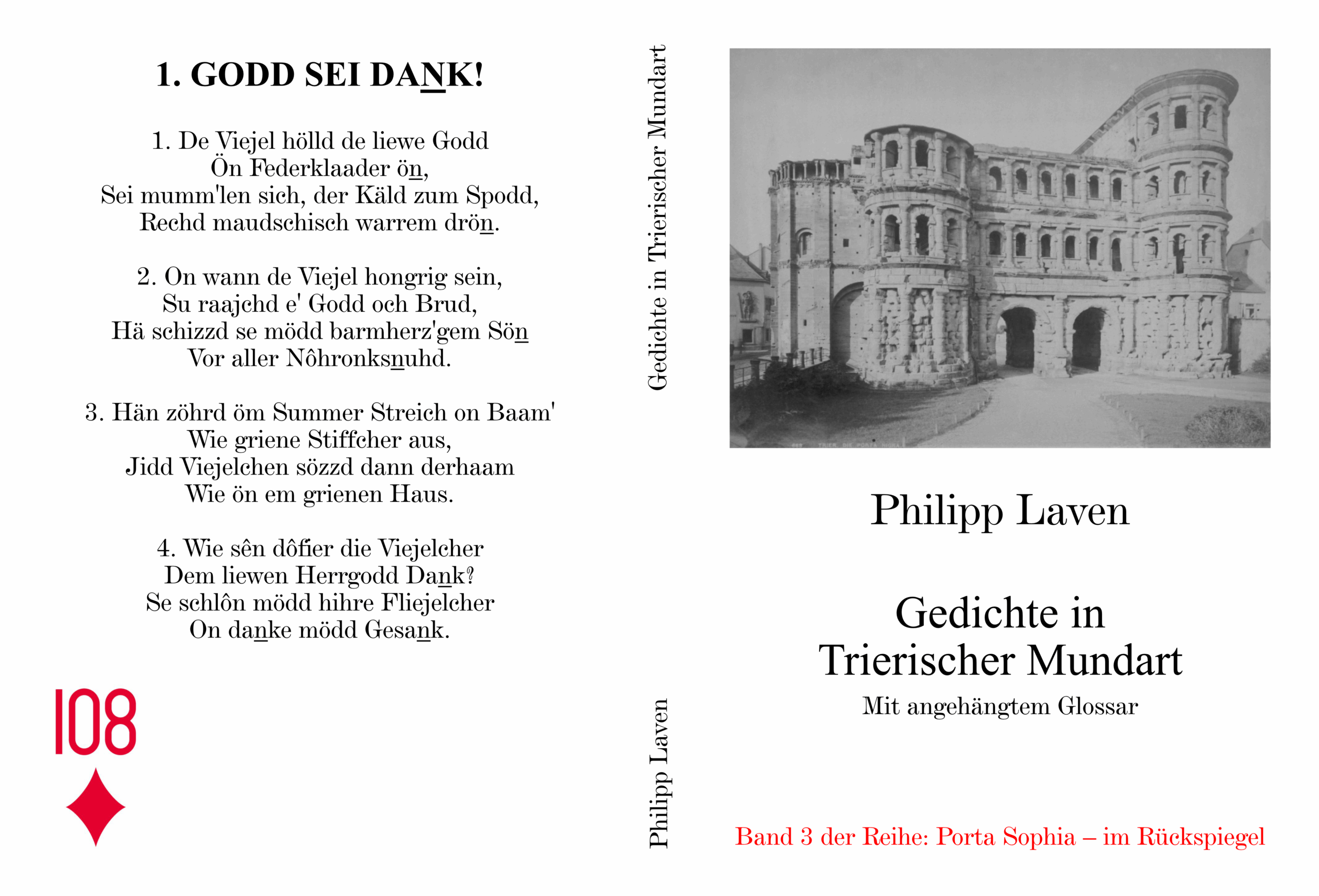Philipp Laven – Gedichte in Trierischer Mundart. Dies ist ein Nachdruck der Erstauflage aus dem Jahre 1858 (Lintz, Trier). Fas­sung in der Schriftart De Vinne, ohne S p e r r u n g e n, die Strophen zentriert, um das Werk leicht les­bar zu machen. Kopfzeilen elimi­niert, Fußnoten in zugehörige Textstellen inte­griert, Paginierung verein­heitlicht. Orthografie und Grammatik verbleiben allesamt wie im Original.