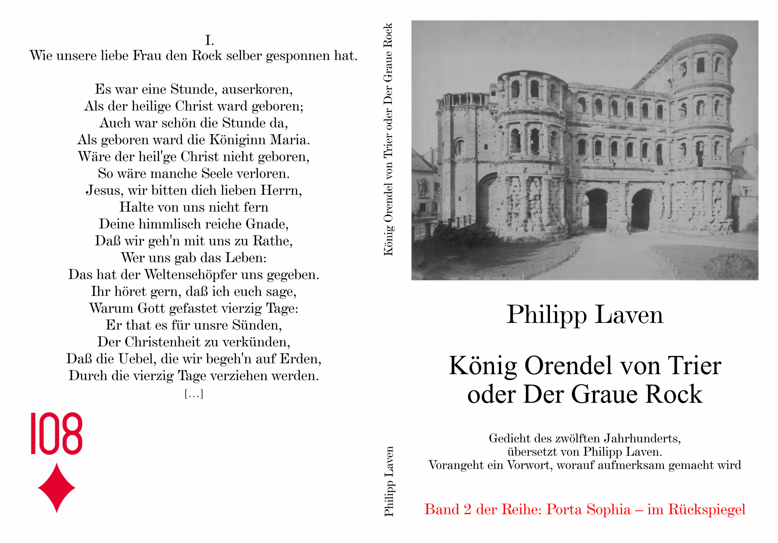 Philipp Laven – König Orendel von Trier oder Der graue Rock. Dies ist ein Nachdruck der Erstauflage aus dem Jahre 1845 (Lintz, Trier). Fassung in der Schriftart De Vinne, ohne S p e r r u n g e n, die Strophen zentriert, um das Werk leicht lesbar zu machen. Kopfzeilen eliminiert, Fußnoten in zugehörige Textstellen integriert, Paginierung vereinheitlicht. Orthografie und Grammatik verbleiben allesamt wie im Original.